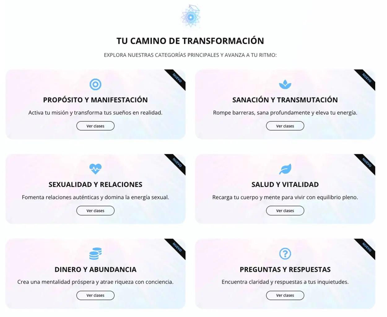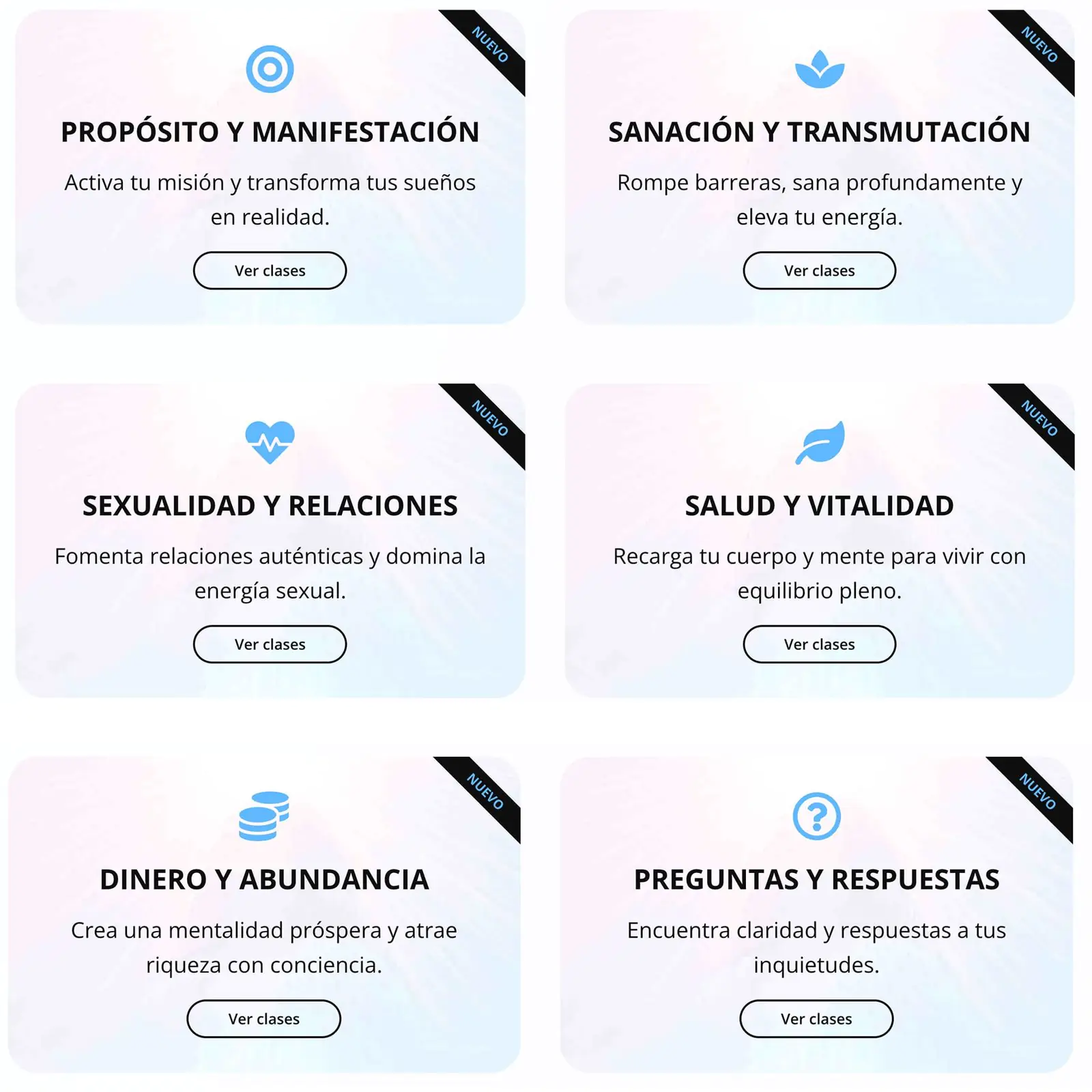 Explora cómodamente una biblioteca exclusiva de más de 50 clases organizadas claramente por áreas clave: propósito, relaciones, salud, abundancia, energía sexual, conexión espiritual y autosanación.